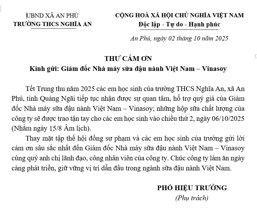 Trong hai năm liên tiếp (2024 – 2025), Công ty Sữa đậu nành Việt Nam – Vinasoy đã mang đến cho thầy và trò Trường THCS Nghĩa An những món quà ngọt ngào và thiết thực – những hộp sữa thơm ngon, bổ dưỡng, tràn đầy yêu thương.