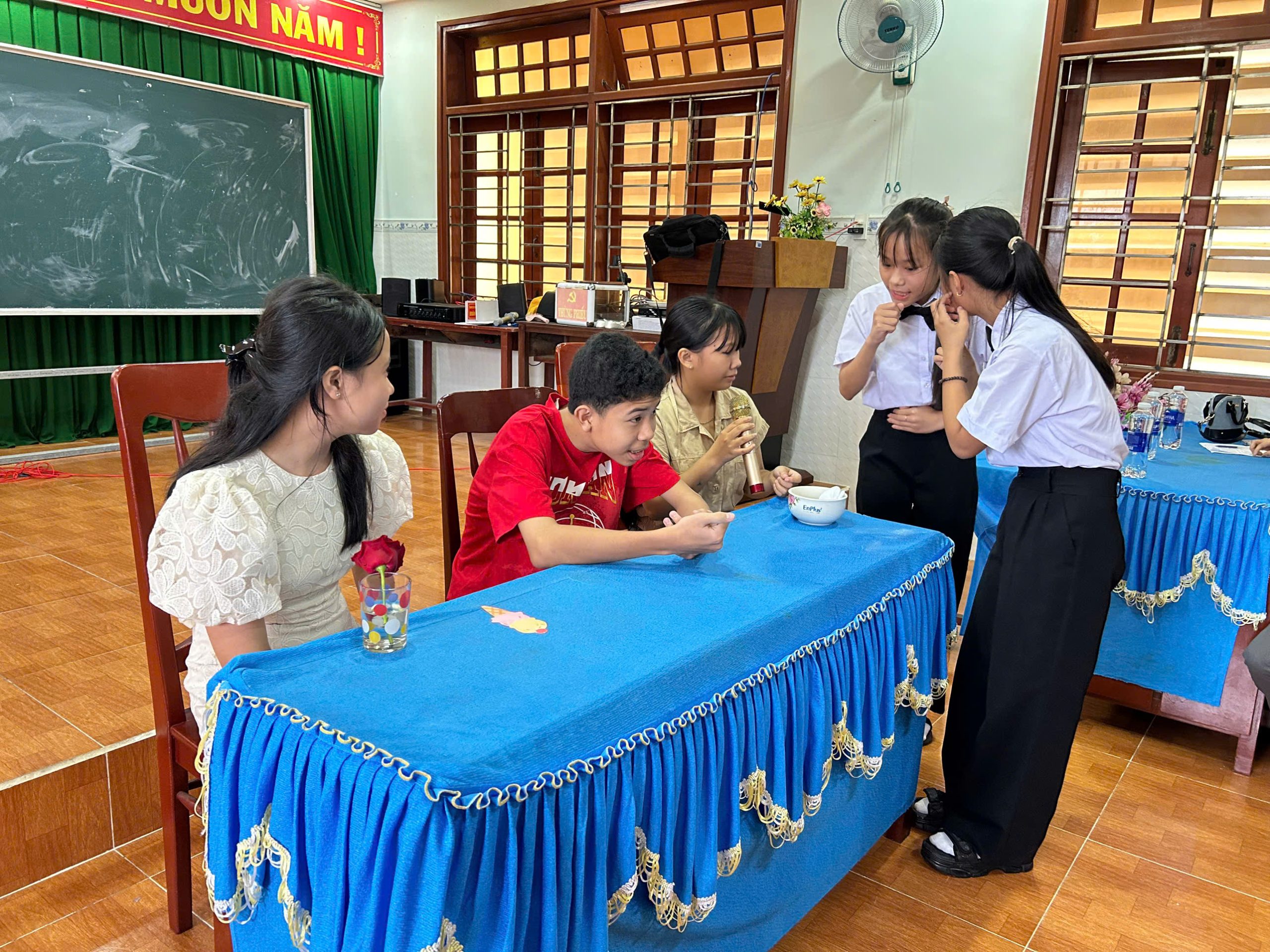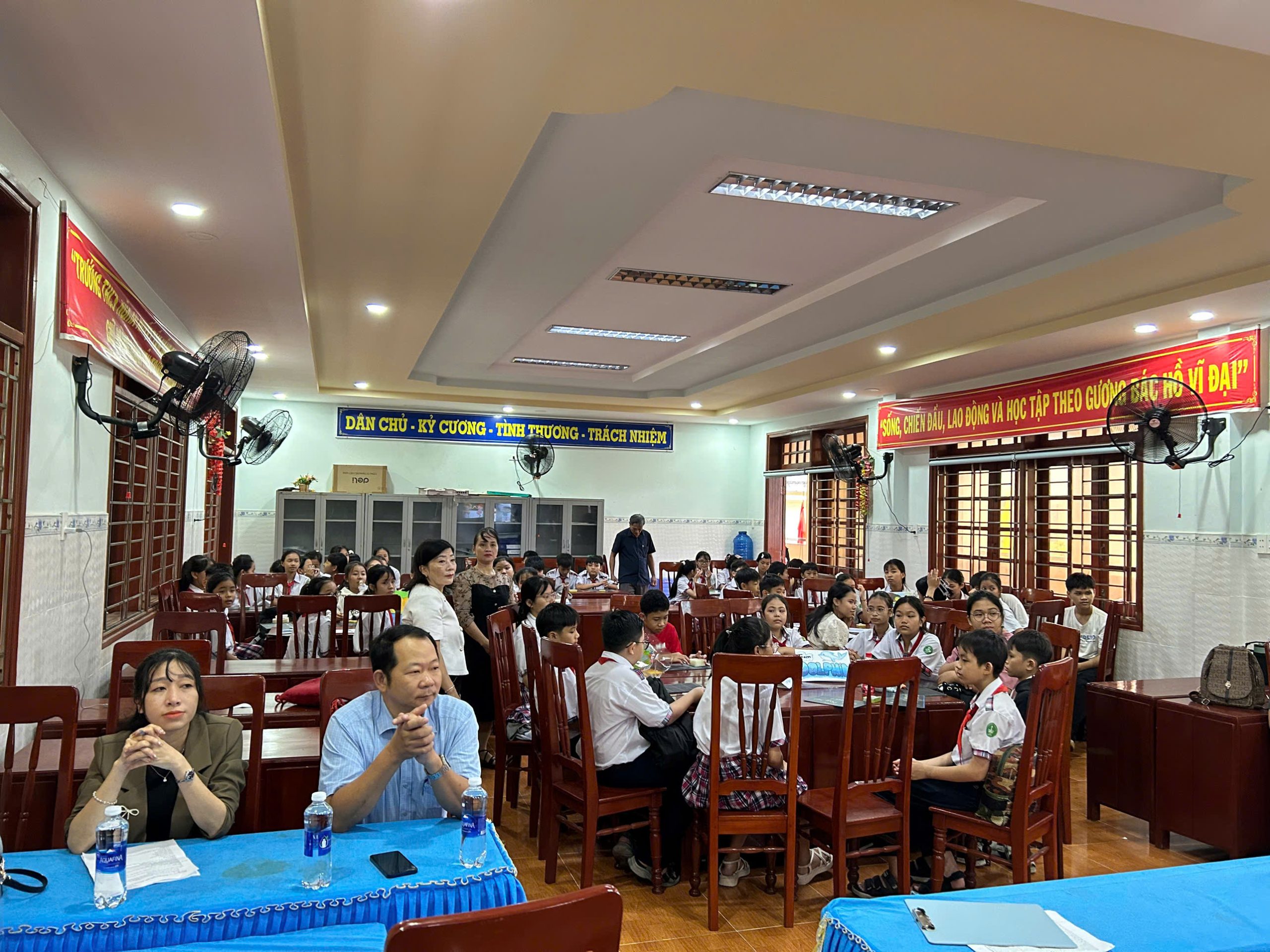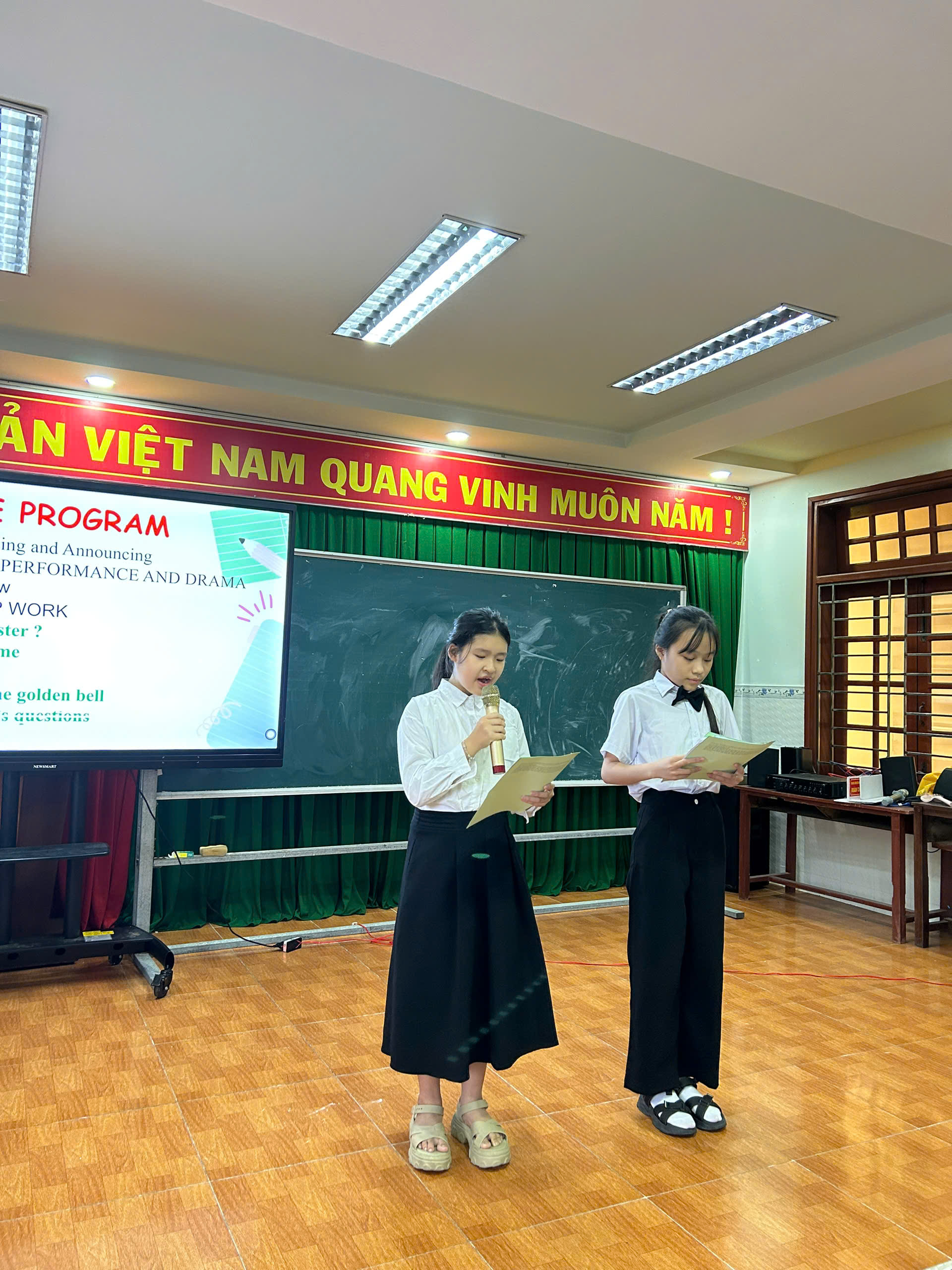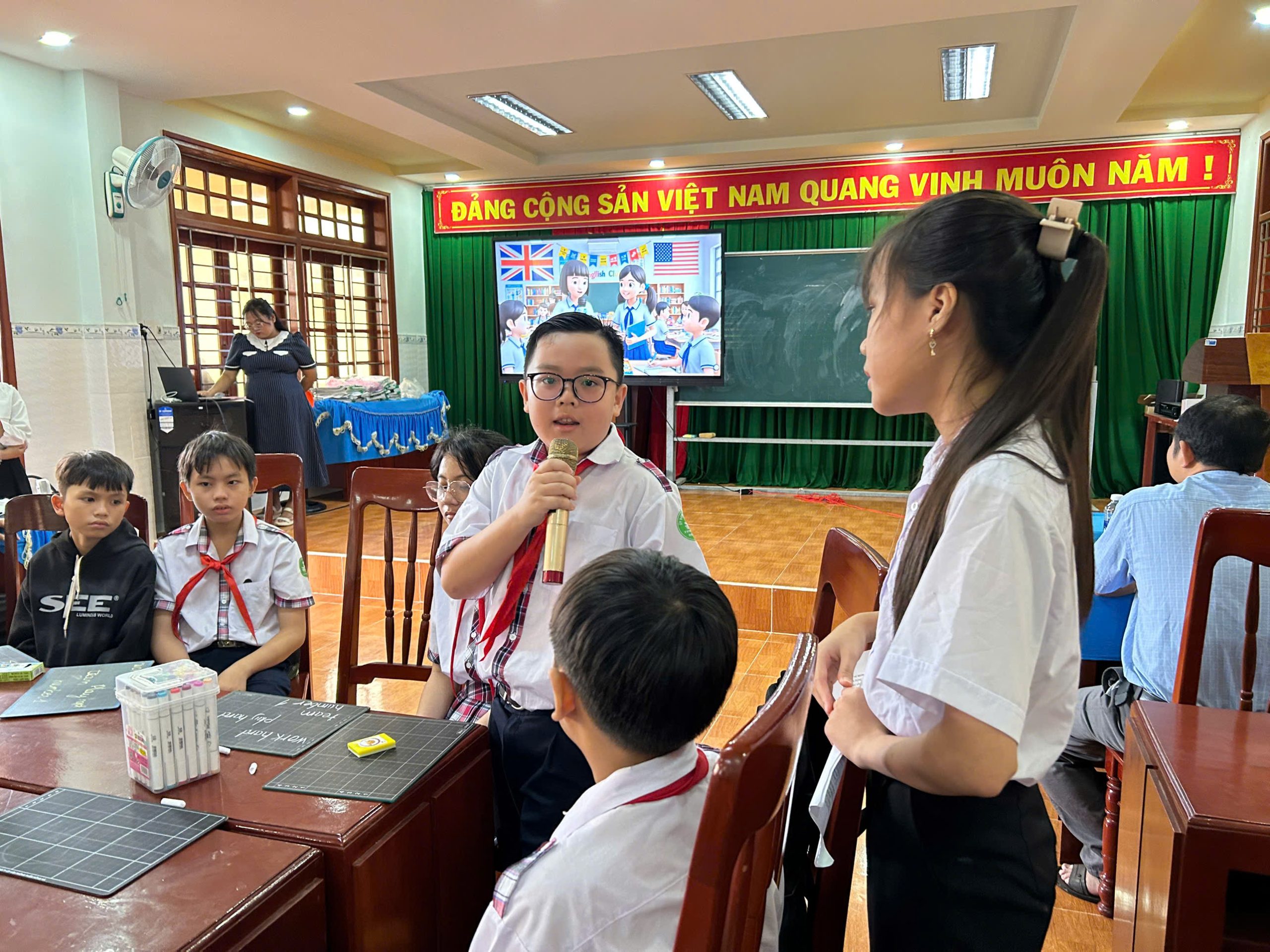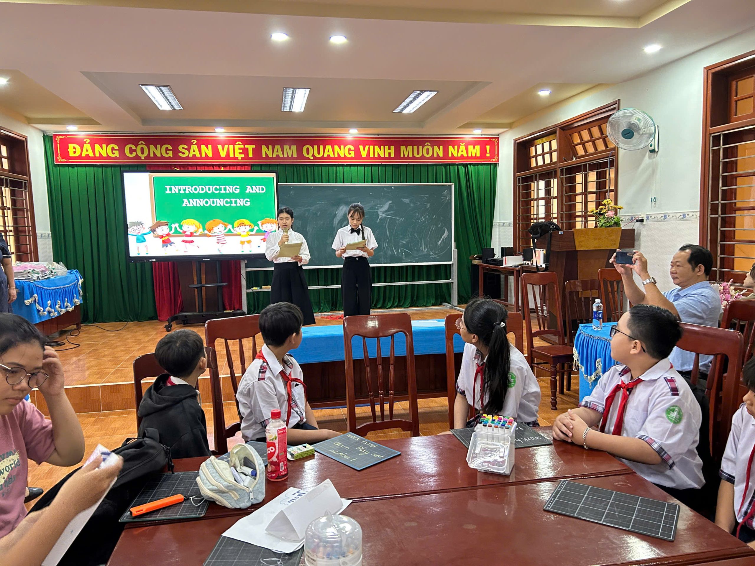 Buổi sinh hoạt có sự tham dự của thầy Kiều Quang Quy và thầy Lý Thanh Hận – Phó Hiệu trưởng nhà trường; cô Lưu Thị Kim Phát – giáo viên Ngữ văn; cùng các thầy cô trong tổ Tiếng Anh và đông đảo học sinh đến từ các khối lớp 6, 7, 8, 9.