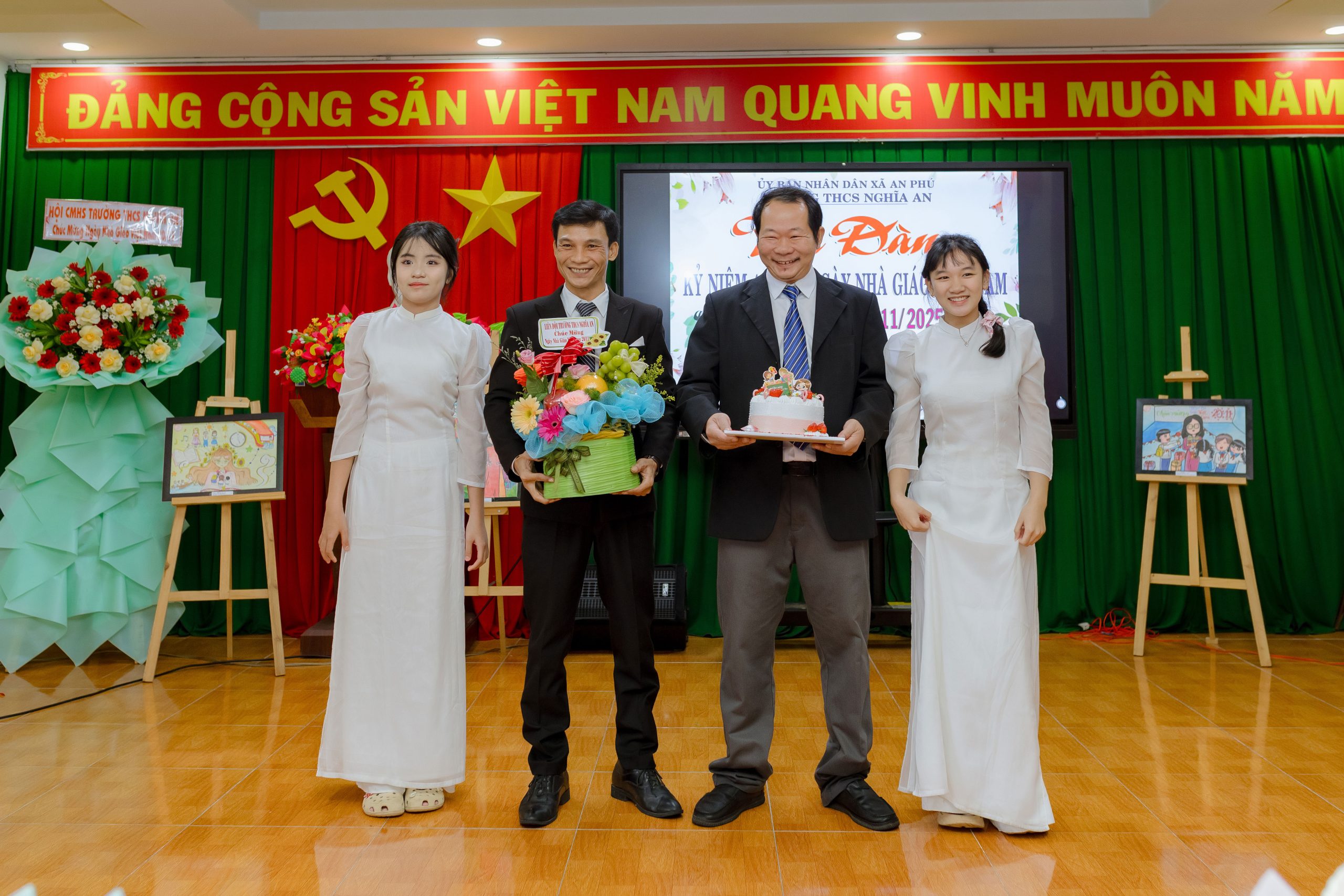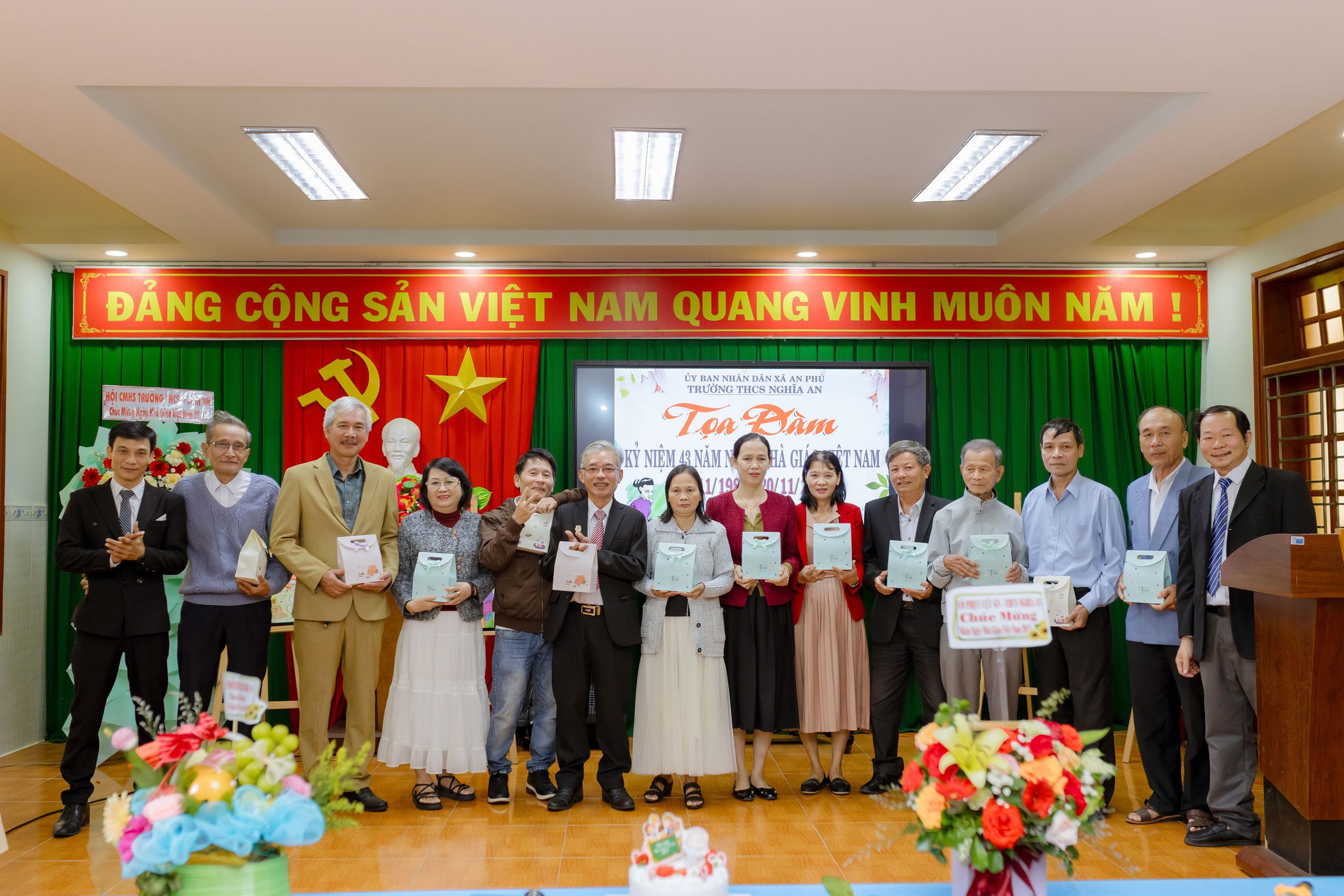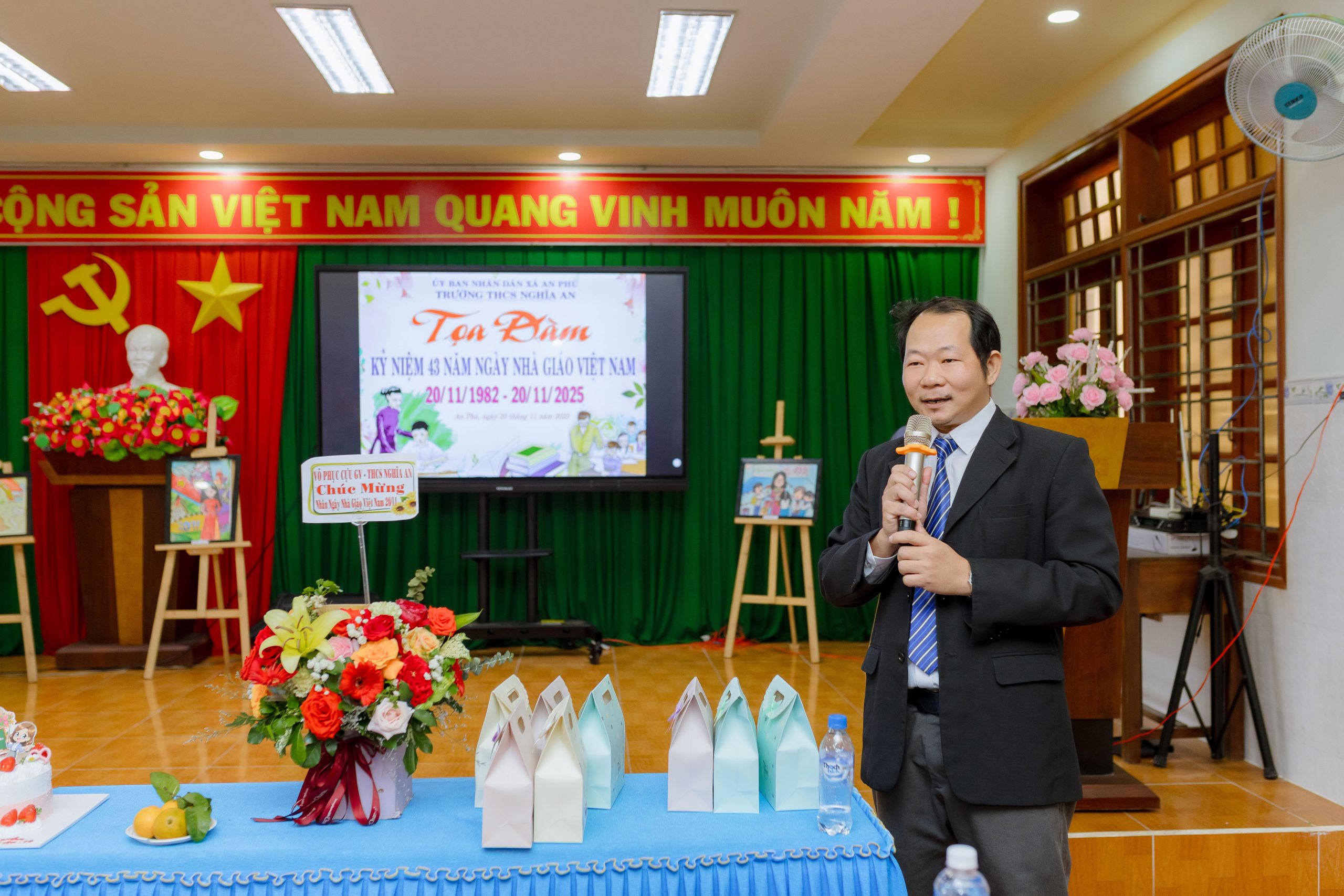 Sáng ngày 20/11/2025 Trường THCS Nghĩa An tổ chức Tọa đàm kỷ niệm 43 năm ngày Nhà giáo Việt Nam (20/11/1982 – 20/11/2025). Mặc dù thời tiết không thuận lợi nhưng đại biểu, thầy cô giáo đều có mặt đông đủ, đặc biệt là các thầy cô nguyên là cán bộ quản lý, giáo viên đã nghỉ hưu vẫn cố gắng về chung vui tạo nên bầu không khí ấm áp, thân tình. Tại buổi tọa đàm, thầy Lý Thanh Hận – Phó Hiệu trưởng nhà trường ôn lại truyền thống ngày 20/11, thầy Kiều Quang Quy – Phó Hiệu trưởng phụ trách thay mặt tập thể nhà trường ghi nhận và cảm ơn sự quan tâm của lãnh đạo địa phương, của các tập thể, cá nhân, của quý thầy cô giáo đã gửi những lẵng hoa tươi thắm, những món quà tinh thần và vật chất đến thầy cô của trường. Đồng thời thầy Kiều Quang Quy cũng thay mặt nhà trường tặng những món quà nhỏ thay lời tri ân đến các thế hệ thầy cô đã nghỉ hưu. Một số hình ảnh ấm áp của thầy cô trong ngày 20/11/2025